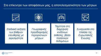 - Στο πλαίσιο αυτό, λοιπόν, ανακοινώνουμε μέτρα περαιτέρω ελάφρυνσης των περιορισμών, έχοντας όμως πάντα κατά νου ότι περισσότερη ελευθερία και σημαίνει και μεγαλύτερη ευθύνη για όλους μας.