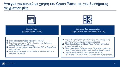 Ο Υφυπουργός παρά τω Πρωθυπουργώ, κύριος Άκης Σκέρτσος είπε: "Προκειμένου να προστατεύσουμε τα νησιά μας κατά τον επόμενο ενάμιση μήνα, θα εφαρμόσουμε από τις 14 Μαΐου στα ταξίδια μας προς και από τα νησιά, την ελληνική εκδοχή του πράσινου πιστοποιητικού.