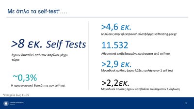Η δήλωση των self-test θα πρέπει να γίνεται στην πλατφόρμα self-testing.gov.gr, ενώ όσοι προσέρχονται σε δημόσιες και ιδιωτικές δομές, είτε για PCR είτε για rapid test αντιγόνου, θα πρέπει να ζητούν την ψηφιακή βεβαίωση με το αποτέλεσμα του τεστ.
