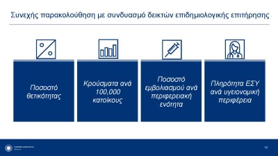 Έτσι, σε εβδομαδιαία βάση θα παρακολουθούμε μέσω του παρατηρητηρίου Covid το ποσοστό θετικότητας στην επικράτεια και τις Περιφέρειες της χώρες, τα κρούσματα ανά 100.000 κατοίκους, το ποσοστό εμβολιασμού και ανοσίας σε κάθε Περιφερειακή Ενότητα και φυσικά, την πληρότητα του Ε.ΣΥ. ανά Υγειονομική Περιφέρεια.
