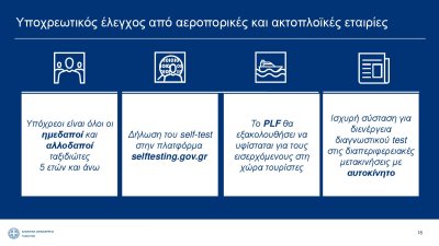 Ο έλεγχος των παραπάνω θα πραγματοποιείται υποχρεωτικά από τις αεροπορικές και τις ακτοπλοϊκές εταιρείες και υπόχρεοι θα είναι όλοι οι ημεδαποί και αλλοδαποί ταξιδιώτες άνω των 5 ετών.