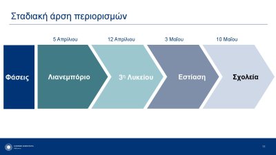 - Ήδη σε αυτό το πλαίσιο, έχουν επαναλειτουργήσει το λιανεμπόριο στις 5 Απριλίου, τα Λύκεια στις 12 Απριλίου, η εστίαση στις 3 Μαΐου και το σύνολο της Πρωτοβάθμιας και της Δευτεροβάθμιας Εκπαίδευσης από τη Δευτέρα στις 10 Μαΐου.