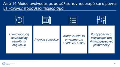 - Από τις 14 Μαΐου, από αυτή την Παρασκευή, όπως έχουμε ανακοινώσει, η χώρα μας, λοιπόν, ανοίγει με ασφάλεια και τον τουρισμό της.