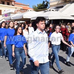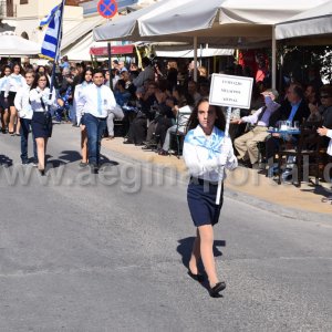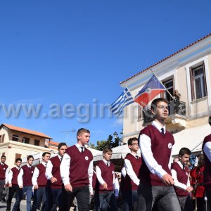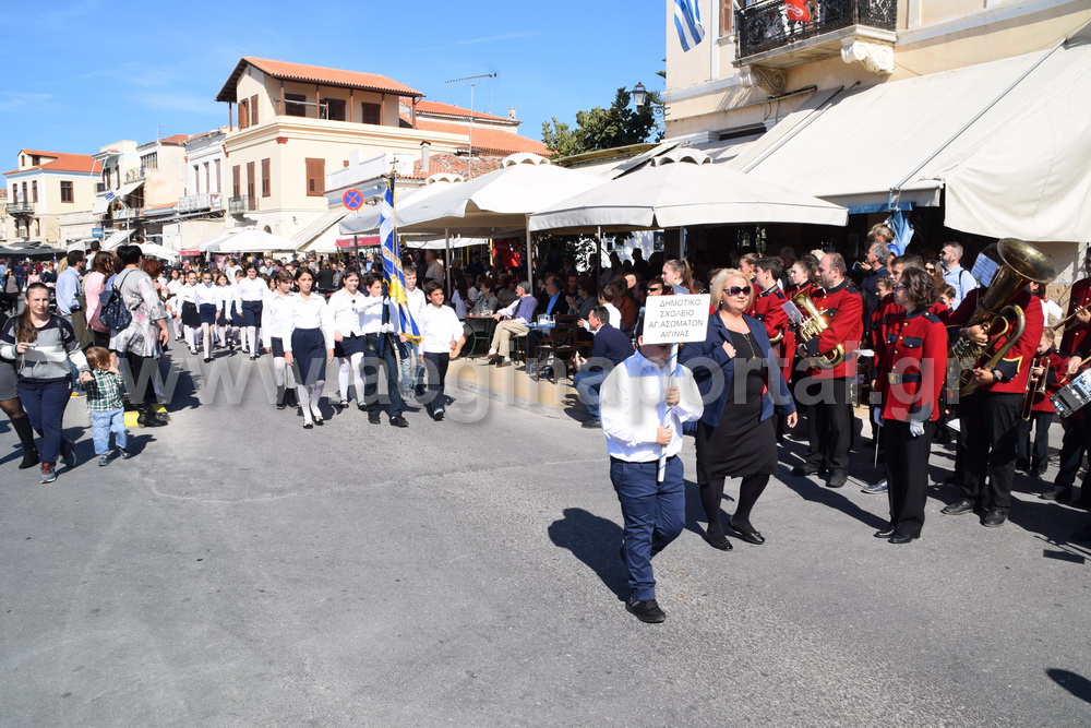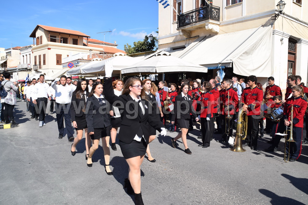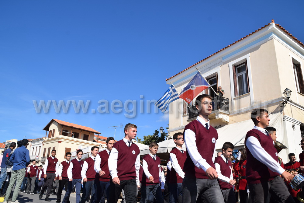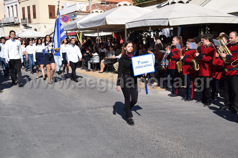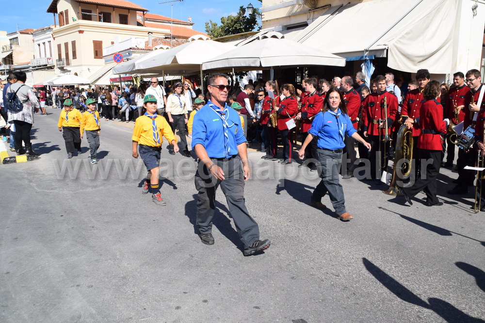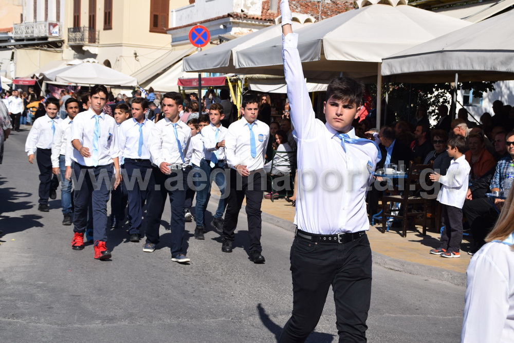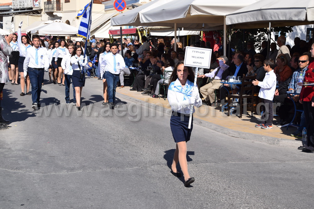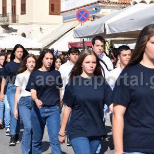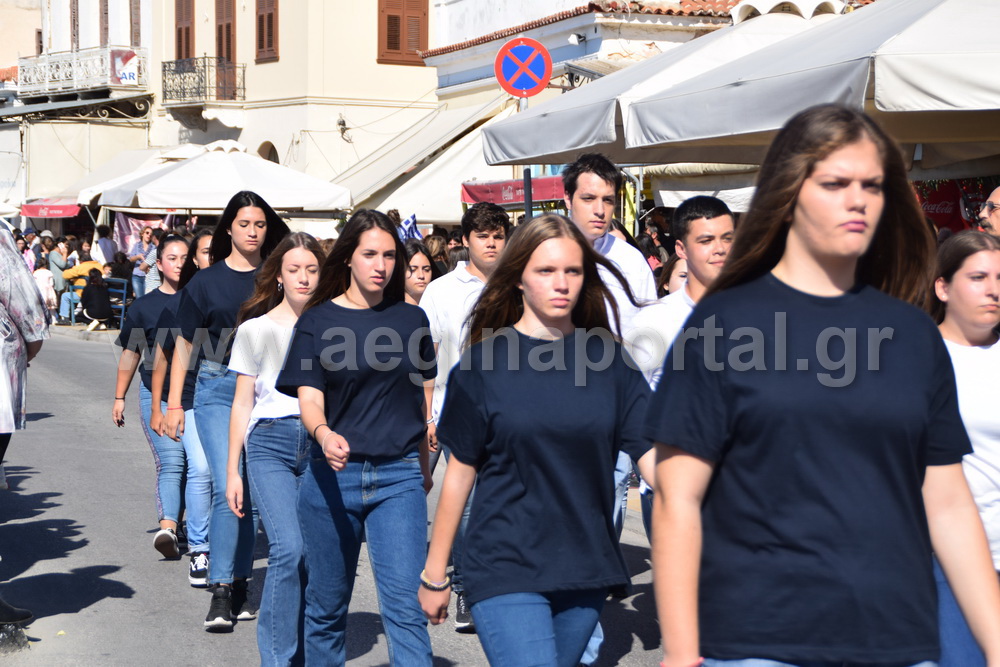 Η μαθητική παρέλαση στην παραλία της Αίγινας για την 28η Οκτωβρίου.