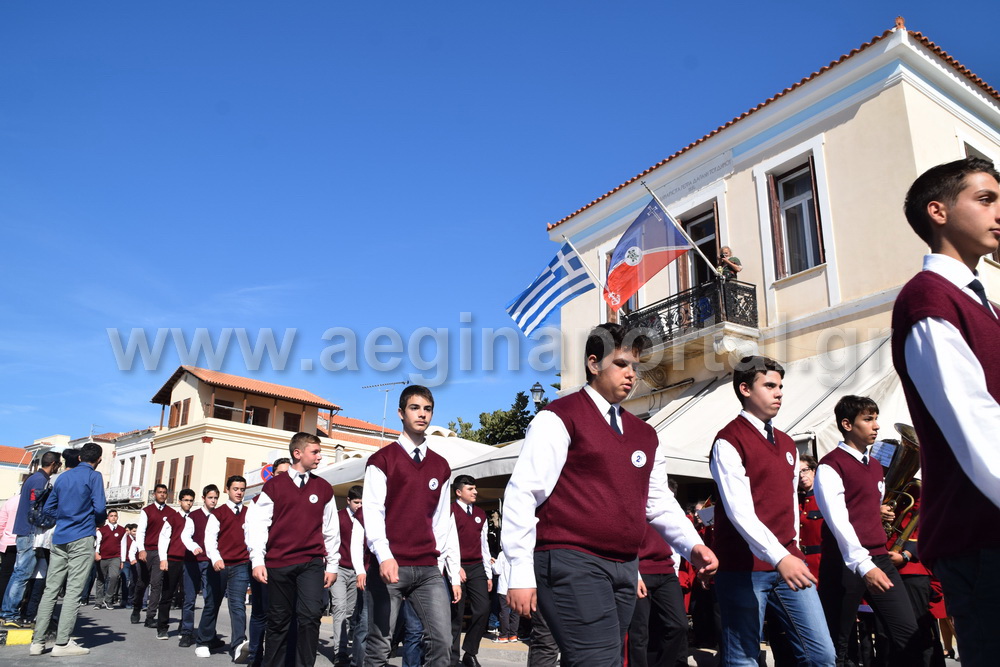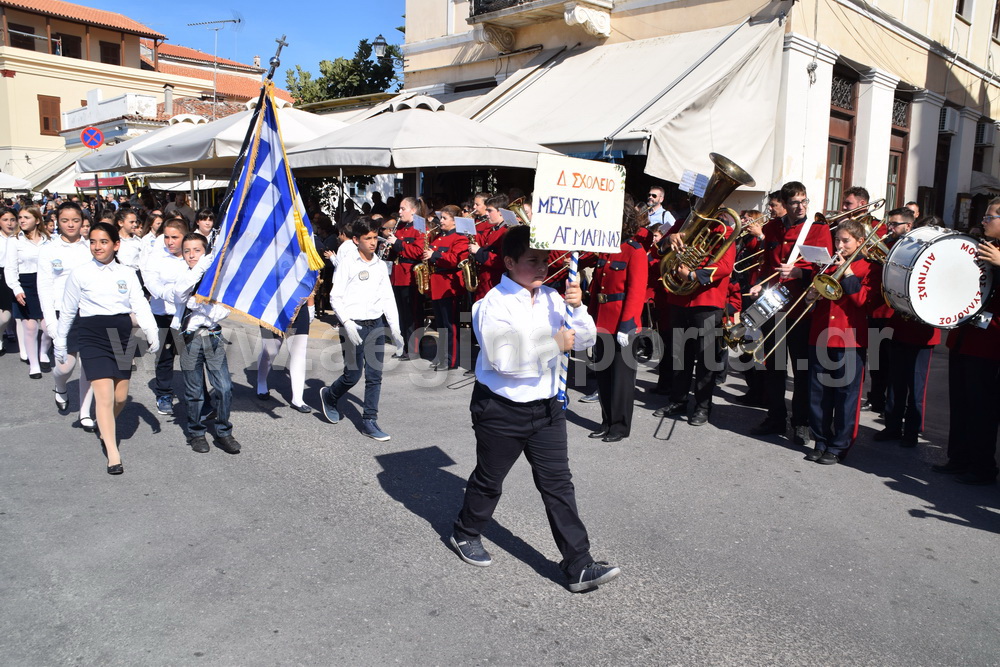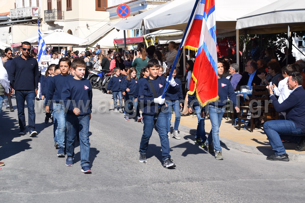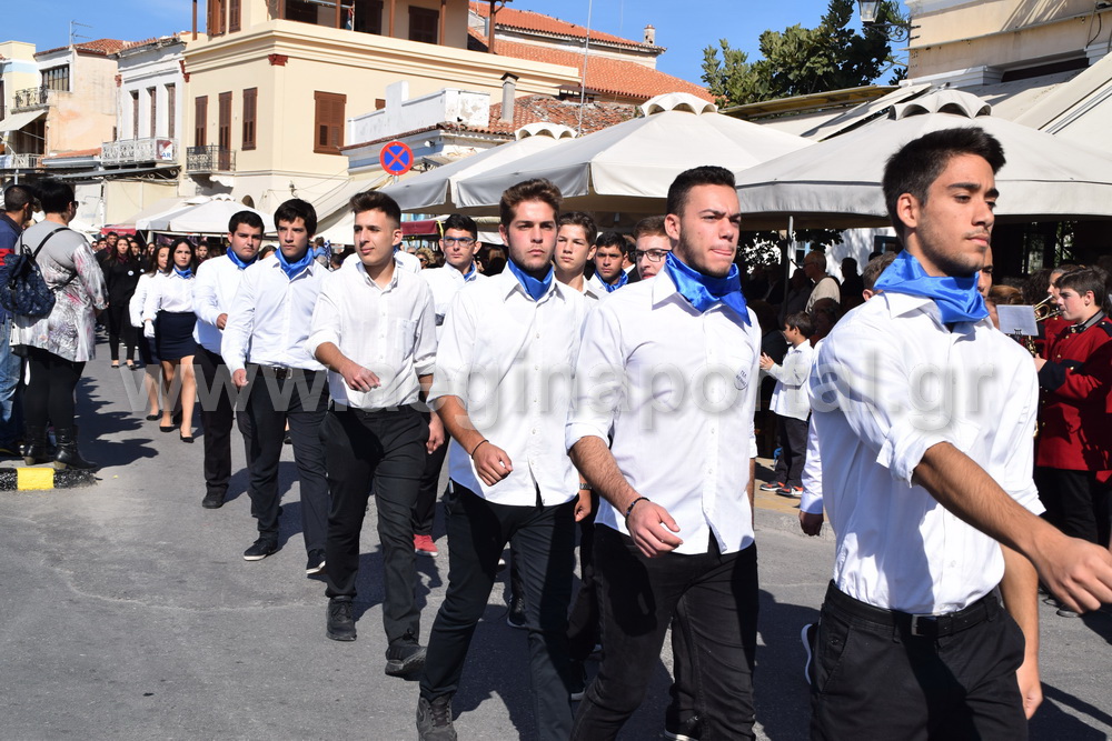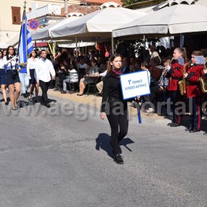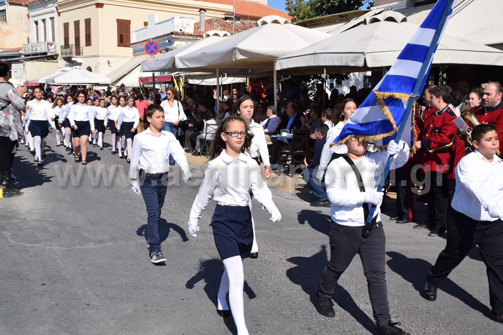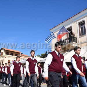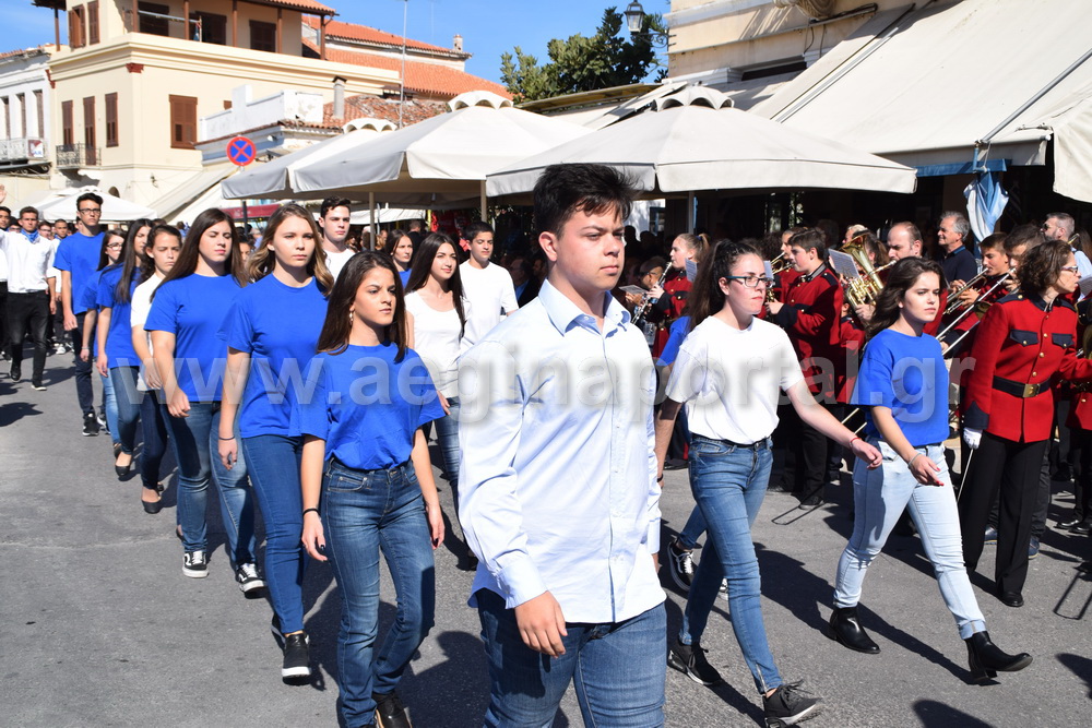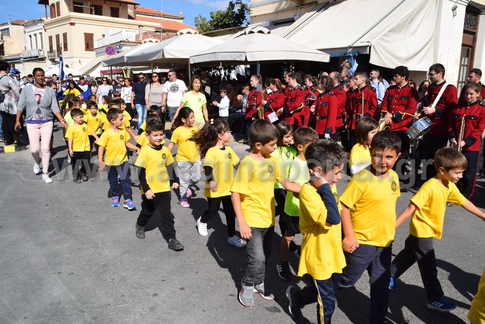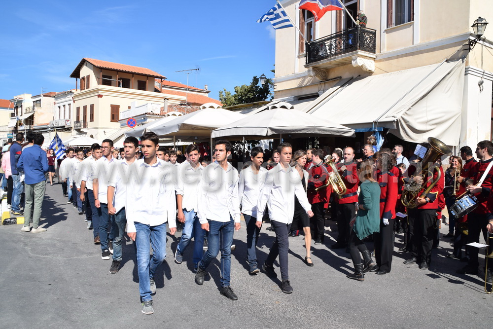Η μαθητική παρέλαση στην παραλία της Αίγινας για την 28η Οκτωβρίου.