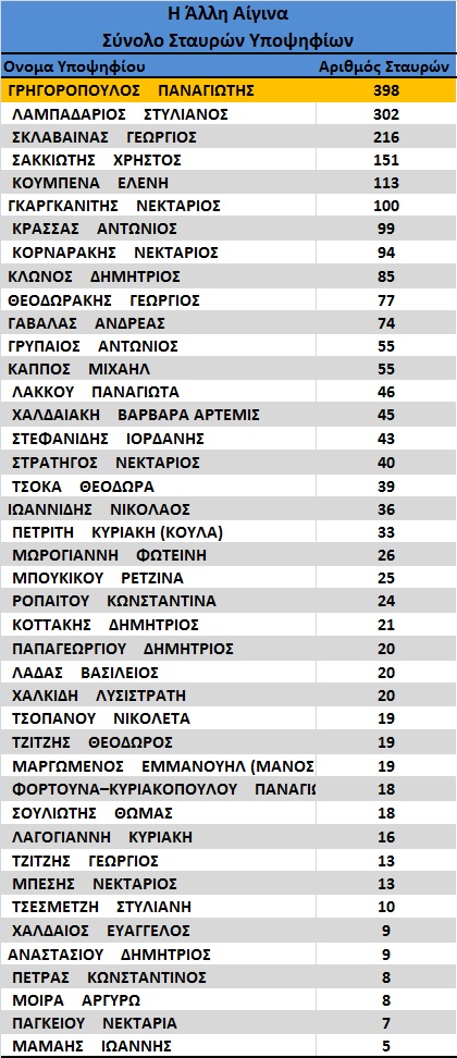 Στους πίνακες που ακολουθούν παρουσιάζεται η σταυροδοσία των συνδυασμών: "Η Άλλη Αίγινα", "Αίγινα Κοινωνία Πολιτών" και "Λαϊκής Συσπείρωσης Αίγινας" στο σύνολο των εκλογικών τμημάτων της Αίγινας, όπως αυτή προέκυψε μετά τη ψηφιοποίηση και την επεξεργασία από το Aegina Portal των αποτελεσμάτων από τα πρακτικά που παρέδωσαν οι δικαστικοί αντιπρόσωποι στο Δήμο Αίγινας.Από τον συνδυασμό "Η Άλλη Αίγινα" εκλέγεται ο επικεφαλής κύριος Φίλιππος Τζίτζης και ο απερχόμενος αρχηγός της αξιωματικής αντιπολίτευσης κύριος Παναγιώτης Γρηγορόπουλος. Από το συνδυασμό "Αίγινα Κοινωνία Πολιτών" εκλέγεται μόνο ο επικεφαλής του συνδυασμού κύριος Αντώνης Ντελής.