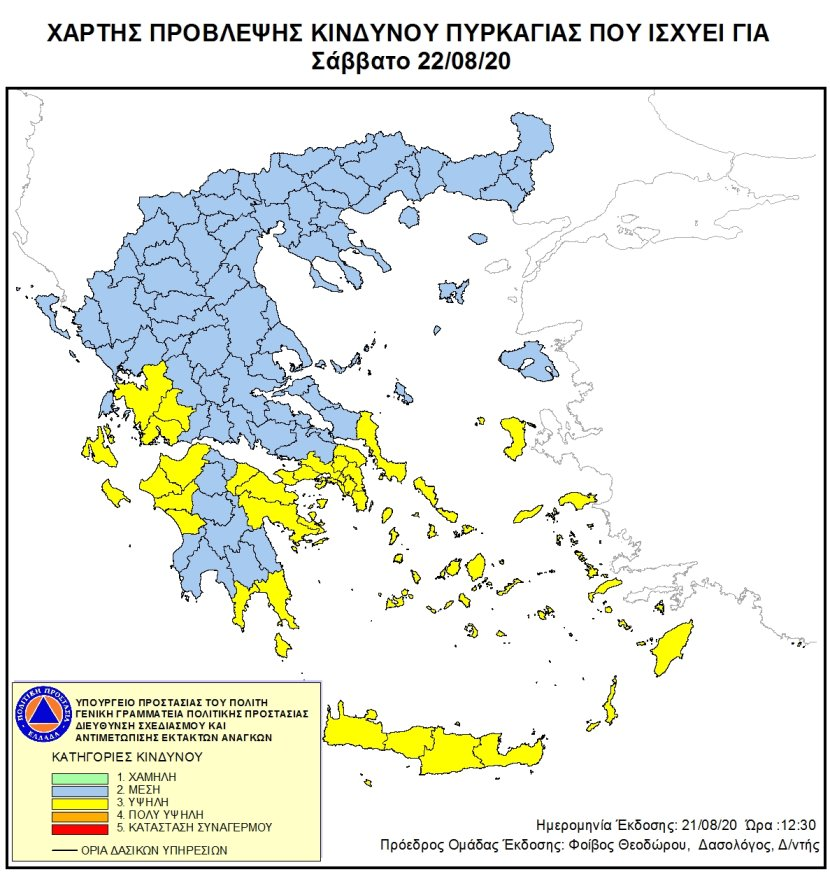 Σε κατάσταση κατηγορίας κινδύνου "υψηλή" για εκδήλωση πυρκαγιάς το Σάββατο 22 και την Κυριακή 23 Αυγούστου η Αίγινα, σύμφωνα με τον χάρτη πρόβλεψης κινδύνου πυρκαγιάς της Γενικής Γραμματείας Πολιτικής Προστασίας.